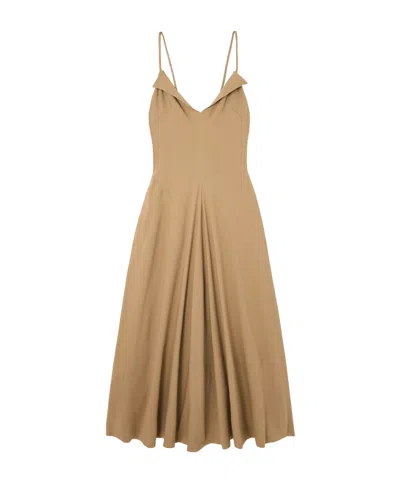 It is made of a lightweight linen blend, with an A-line silhouette, V-neck, and pleats at the lower back.