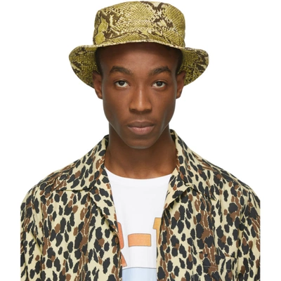 弹力棉质丝绒水桶帽,通体饰有黄色、白色和黑色相间的图案。附衬里,同色系缝线。