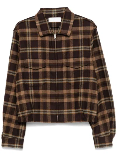 brown wool plaid check pattern front zip fastening spread collar long sleeves with buttoned cuffs two chest flap pockets elasticated hem