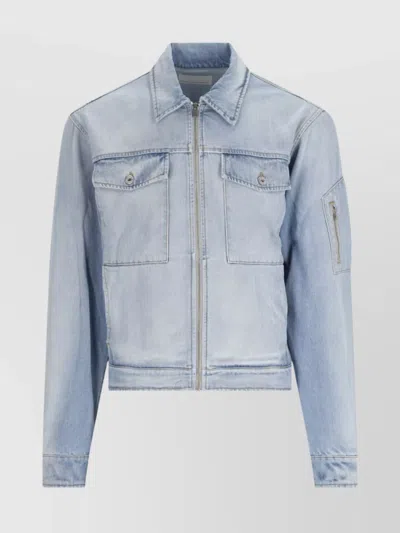 light blue cotton washed denim contrast stitching logo-engraved buttons logo patch to the rear classic collar long sleeves with buttoned cuffs two chest flap pockets slip pockets to the sides sleeve zip pocket front zip fastening straight hem unlined