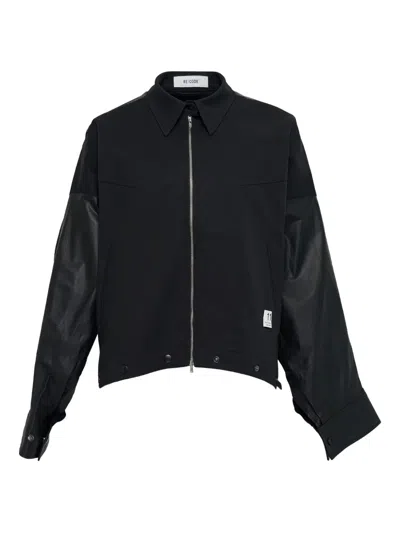 黑色 皮质衣袖 正面拉链 衬衫领 搭扣袖口 直筒造型