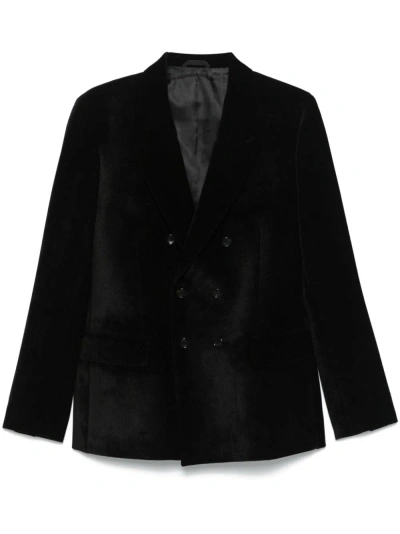 黑色 天鹅绒 斜纹织物 双排扣 戗驳领 垫肩 长袖 搭扣袖口 胸口饰有平袋 两个正面盖袋 英式背面开衩 全衬里 平直下摆