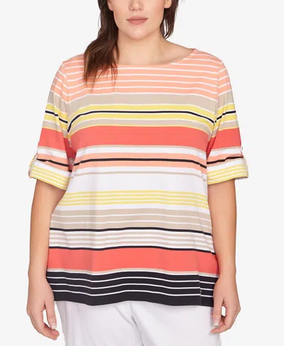Ruby Rd. Plus Size Multi Stripe Roll Tab Top In Red