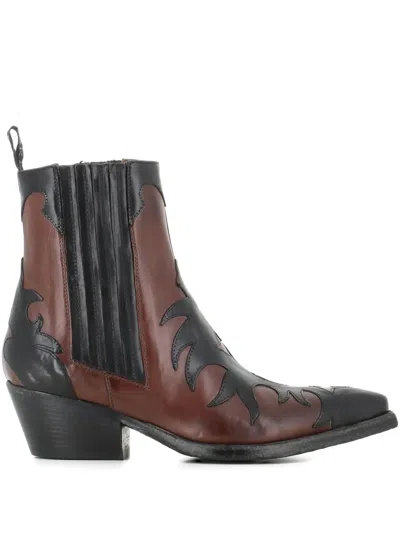 褐色和黑色 皮质 火焰图案 尖头 低跟 弹性侧面拼接