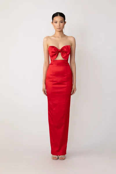 Strapless satin pencil gown with a fully-boned bodice featuring a large bow detail and cutout