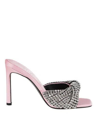 blush 粉、银色、水晶/晶饰、小牛皮、缎面效果、晶饰镶嵌、logo皮质鞋垫、露趾、方头、穿套式。