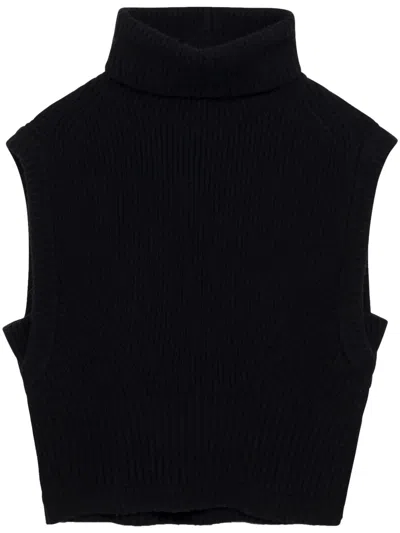 黑色 羊毛羊绒混纺 罗纹边饰 高领 无袖