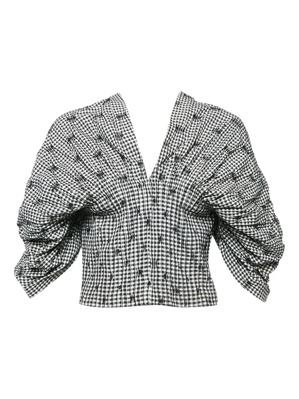 黑色 格纹图案 泡泡袖 V领 胸前饰有缩褶细节 状态:很好。这款典藏臻品商品状态很好,略有使用痕迹,可能存在于材料或电镀褪色及划痕。