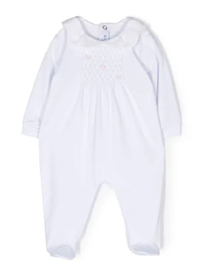 白色、弹性棉质、褶饰、花卉刺绣、扇贝形领、后置摁扣、长袖、覆盖脚面。