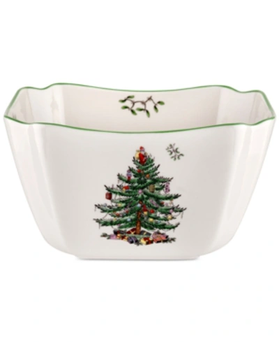 Cream Fine Earthenware Small Bowl With A Green Trim Part Of The Christmas Tree Collection Measures 6.75In Square Care Instructions: Dishwasher, Microwave, And Oven Safe Imported