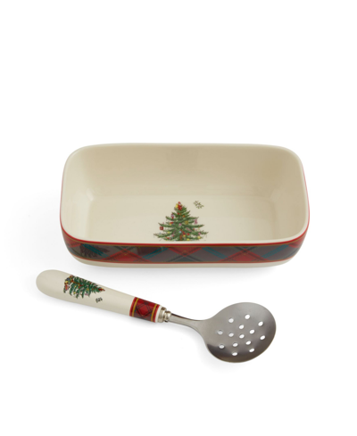 The Christmas Tree tartan rectangle server with slotted spoon brings rustic charm with a traditional tartan plaid border surrounding a creamy center featuring the iconic Spode Christmas Tree design. A perfect complement to Spode Christmas Tree or the start of a new collection.
