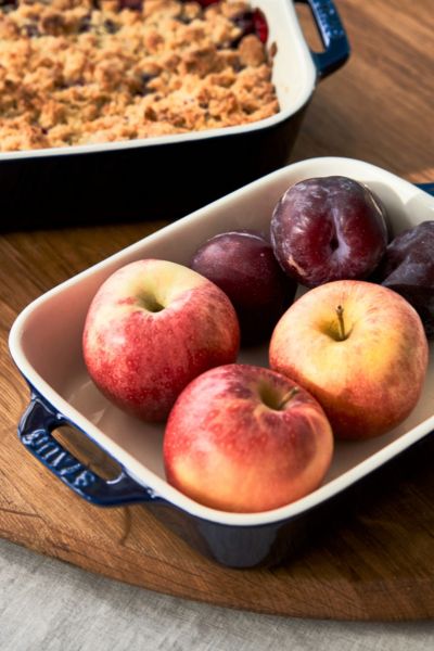 Staub rectangular stoneware bakers gently retain heat and won't absorb moisture, producing a delicious result for all of your favorite dishes. The stackable 2-pack rectangular dishes measure 7.5" x 6" and 10.5" x 7.5" and are perfect for lasagna, casseroles, desserts, as well as roasted meats and vegetables, and transition beautifully from oven to table. Staub Ceramic 2-pc Rectangular Baking Dish Set in Dark Blue at Urban Outfitters