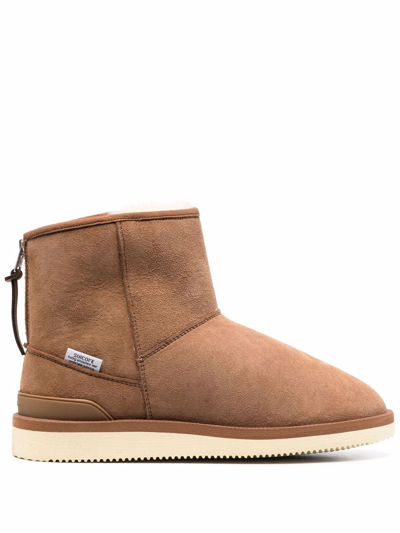 设计细节:褐色、侧面logo贴花、皮毛一体边饰、后置拉链、及踝、圆头、橡胶平底、鞋垫饰有标志。