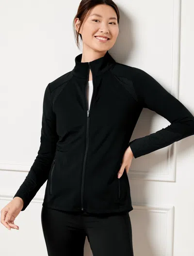 Part of T by Talbots, our most comfortable collection ever! Our adventure-ready jacket makes for the perfect active essential. Made to move with moisture-wicking and flattering compression fabric to keep you dry and comfortable. Features a full zip front closure, on-seam zip pockets and a curved high-low hem. Features Long Sleeve Hits At Hip Front zip closure On Seam Zip Pockets High-Low Hem Imported Fit: Misses: 27 1/2" Material: 80% Nylon, 20% Spandex Care: Machine Wash Cold; Only Non-Chlorine Bleach When Needed; Tumble Dry Low; Cool Iron, If Needed | Performance Interlock Jacket - Black - Small Talbots