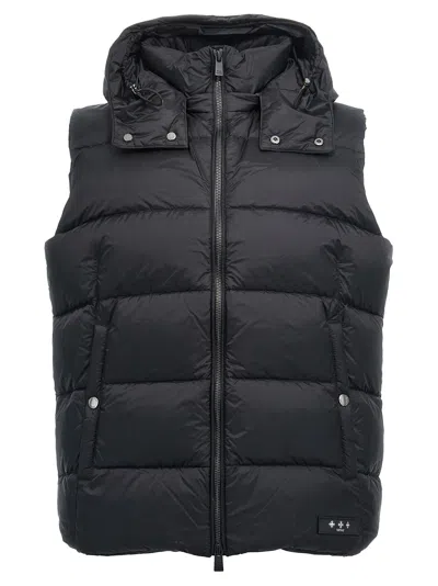 techno fabric, brand logo, solid color, hooded collar, single-breasted , sleeveless, goose down interior, zipper closure, multipockets, double face, contains non-textile parts of animal origin, single-breasted jacket , Color: Black , Size: 5