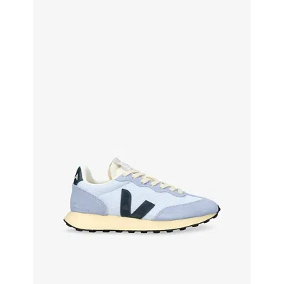 Veja Rio Branco Sneaker in Swan & Nautico - Blue. Size 41 (also in 36, 37, 38, 39, 40). Hexamesh and suede upper with waffle rubber sole. Made in Brazil. Lace-up front. Rubber and synthetic insole. Leather and water-repellent suede panels. Rubberized signature logo detail at sides. VFJA-WZ103. RO1803876. About the designer: Parisian based and Brazilian produced, sustainable sneaker brand Veja creates organic, innovative collections sourced from South America. 'Veja' translated from Portuguese-Brazilian dialect meaning 'look', aims for wearers to 'look beyond sneakers, look how they are made'. Their iconic silhouettes are naturally sourced from 100% organic cotton canvas and Brazil-sourced leather, along with fairly traded rubber soles. The resulting designs allow wearers to go about their day comfortably, all while leaving a positive impact on the environment. By linking together economic justice and social initiatives, and utilizing products that impact the environment positively, Veja has proven that sustainable styles can also be deemed fashionable.