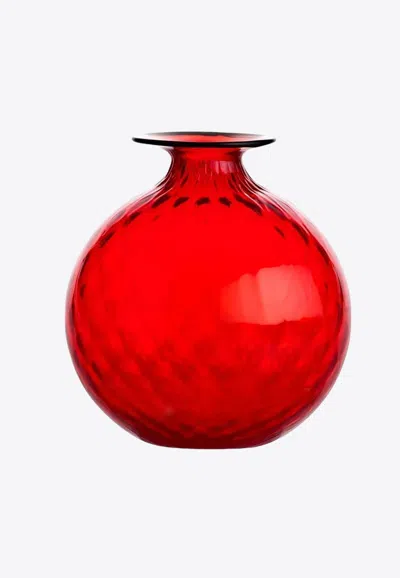 Combining hand blown glass with Venini's revered balloton technique, in which a hot glass thread is applied to the upper part of a vessel to create a raised pattern, the 'Monofiore' bottle presents a charming duality of delicateness and sturdiness. The small red vial can be utilised to store liquids or may simply be displayed.