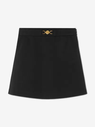 黑色 密织 Medusa 标牌细节 金色五金配件 高腰 侧面饰有隐藏式拉链 A字裙摆 膝上长度 平直下摆