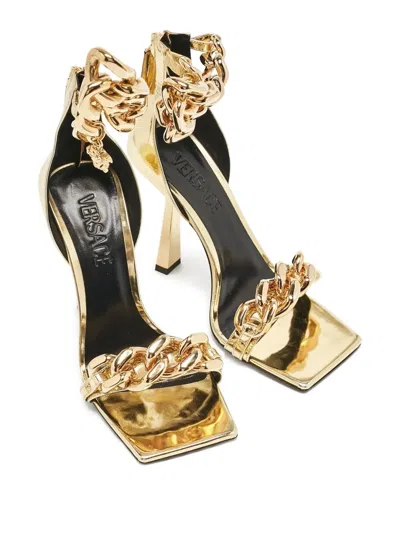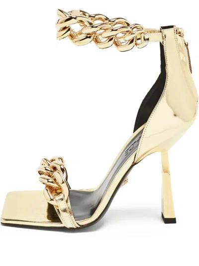 金色 金属感 背面拉链 链式细节 露趾方头 创意高跟 状态:未经穿戴。这款典藏臻品商品未经穿戴且为原始状态,虽然它未附原始标签