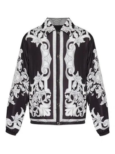 Immerse yourself in the epitome of luxurious versatility with the Reversible Jacket by Versace. This classic silhouette, expertly designed with a button-down closure and distinguished collar, exudes both elegance and modernity. One side boasts a majestic baroque pattern in striking white on a deep black backdrop, while the opposing side offers a minimalist all-black finish, emblazoned subtly with the iconic