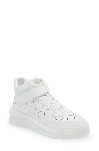 白色、小牛皮、镂空/雕花设计、鞋舌有logo贴花、圆头、正面魔术贴系带开合。