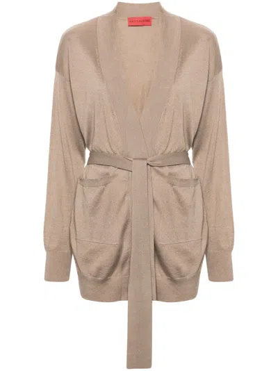 灰褐色 羊绒真丝混纺 针织结构 无翻领 开襟式 落肩 长袖 罗纹袖口和下摆 两个正面贴袋 可拆卸腰带 平直下摆
