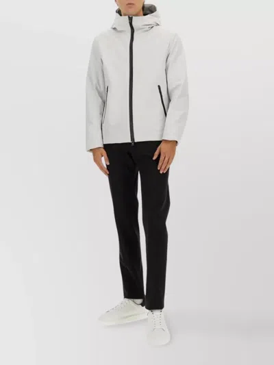 This modern jacket by Woolrich is crafted from a lightweight blend of 94% polyester and 6% elastane, ensuring both comfort and a tailored fit. The design features a sleek hood, full front zipper, and zippered side pockets adorned with contrasting black trims, epitomizing minimalistic sophistication.The model is 190 cm tall and wears size L.Specifications - Composition - 94% Polyester, 6% Elastane Origin - Made in Indonesia